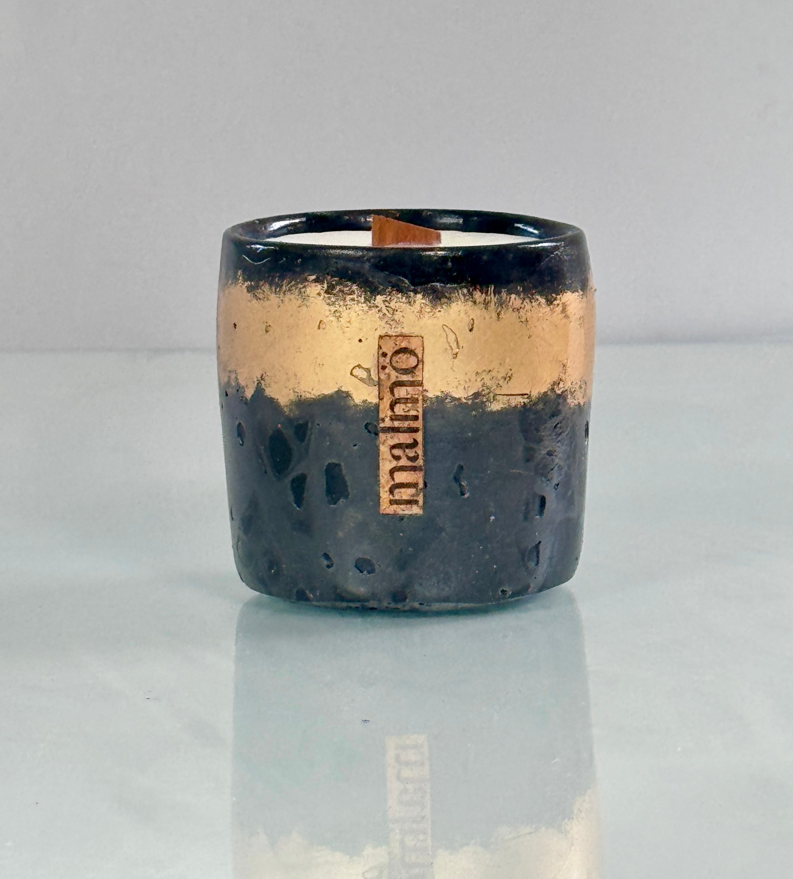 Refillable and Handmade Candle Pot in Charcoal Shades with a Gold Band.