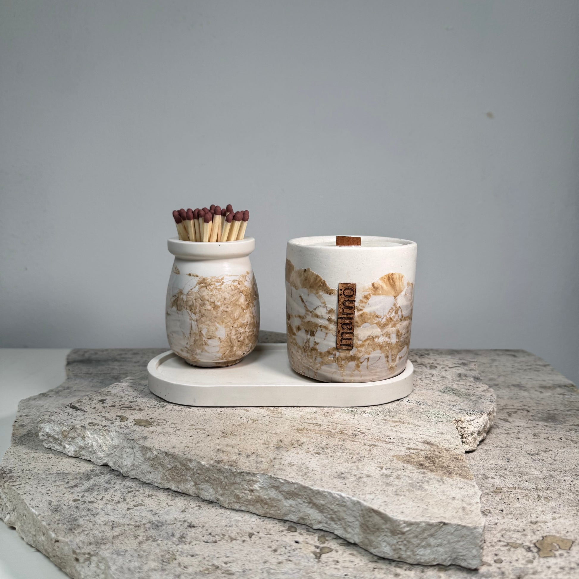 Handcrafted in UK, our refillable Candle Pot Set comes with, Tray and Match Pot (including Matches and Striker).