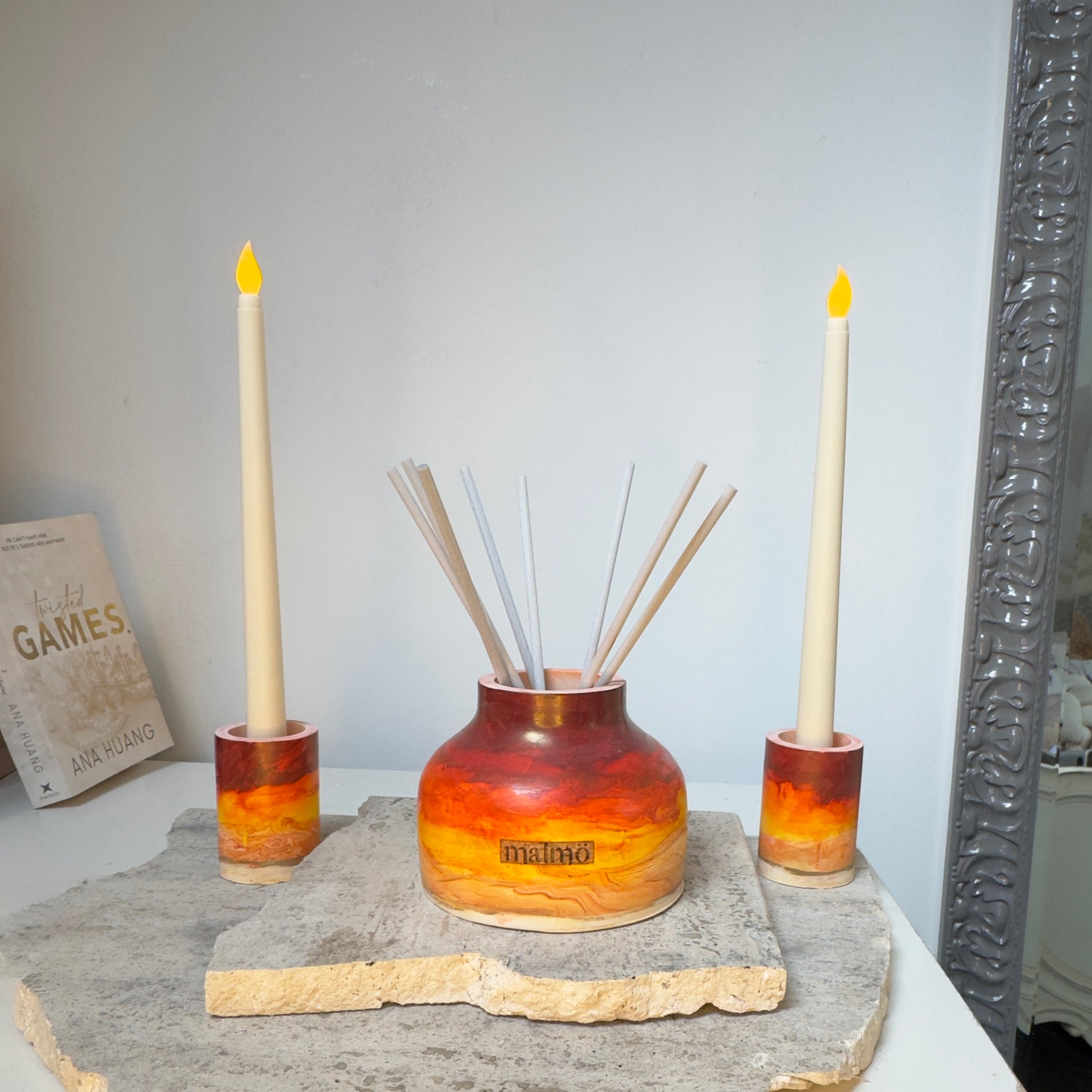 Layered tones of amber, burnt orange and soft neutrals, inspired by the glow of late summer evenings. Designed to bring depth and atmosphere into your space, each piece carries its own shades and colour pattern.
