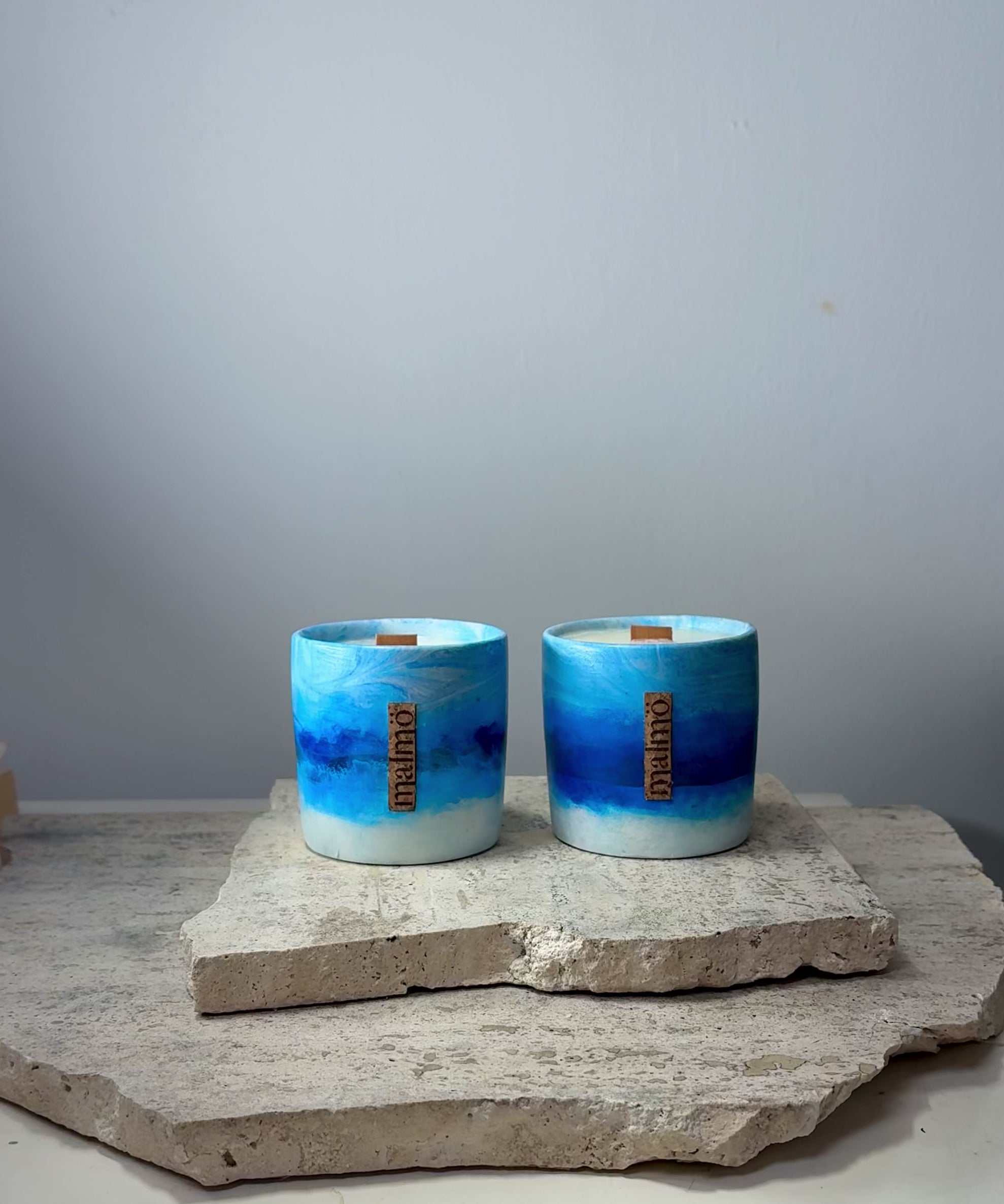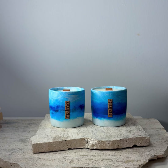 Sky effect tones in a refillable candle pot with a hand poured soy wax candle and FSC-certified crackle wood wicks.