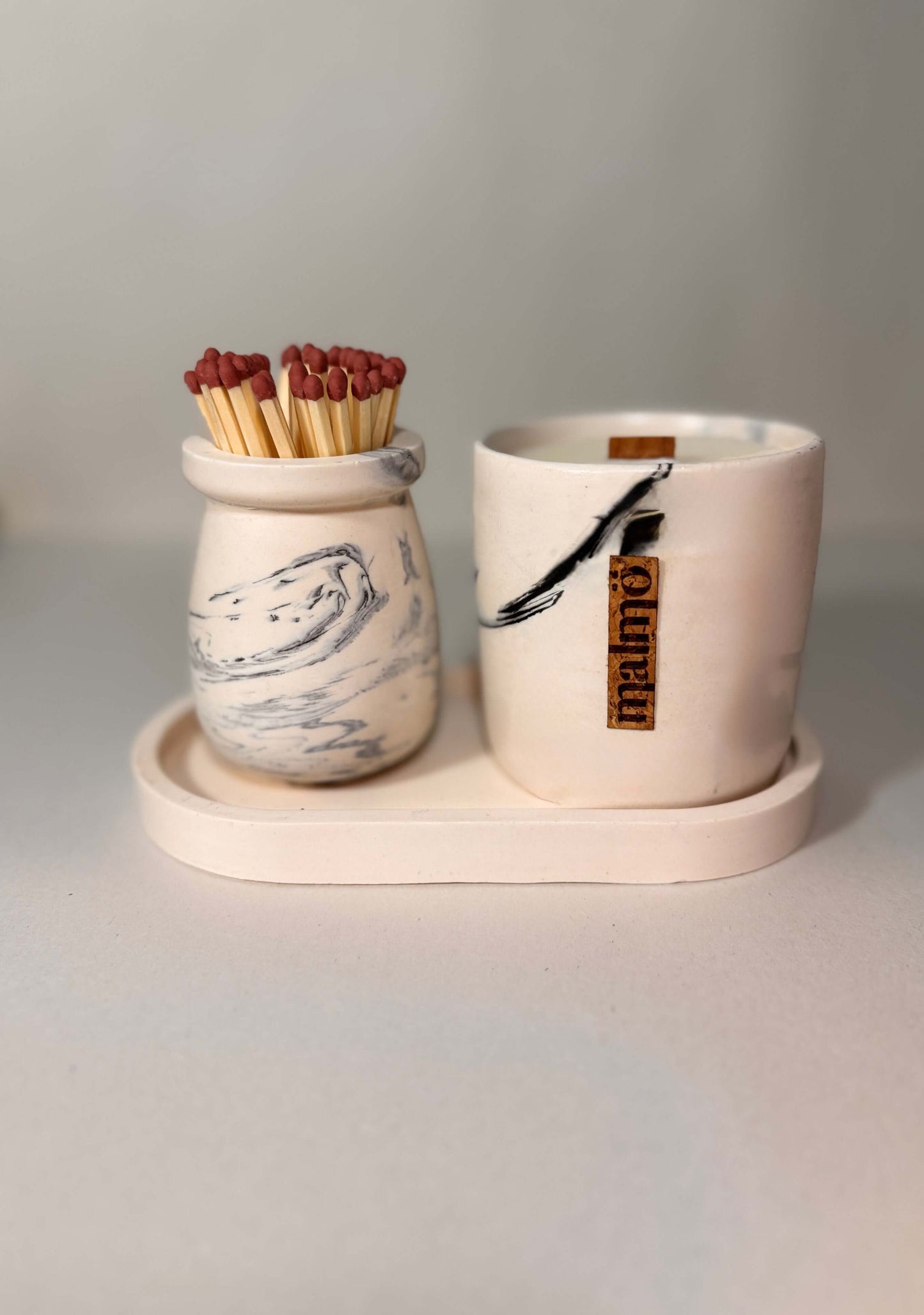 Handcrafted in UK, our Refillable Candle Pot Set comes with a single Pot, Tray and Match Pot (including Matches and Striker).